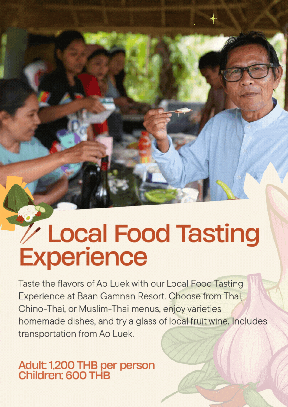 Join us for a laid-back food journey at Baan Gamnan Resort in Ao Luek. Choose in advance from three cultural menus — Thai, Chino-Thai, or Muslim-Thai — each featuring five traditional dishes made with care and family recipes passed down through generations.